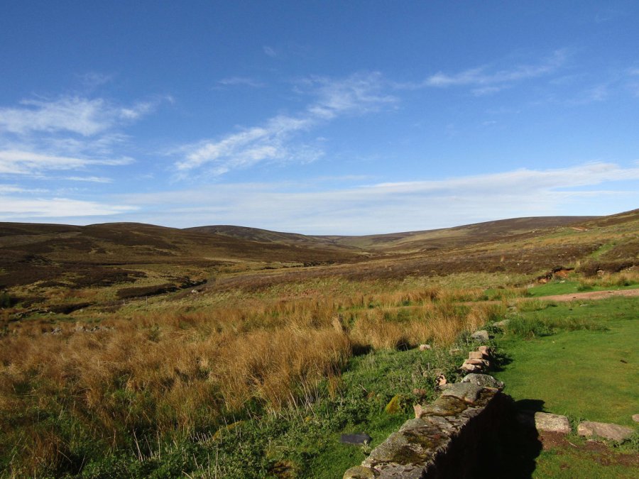 Facing South from Tarfside – The eagle eyed may see a well hidden house in the middle of the copse.