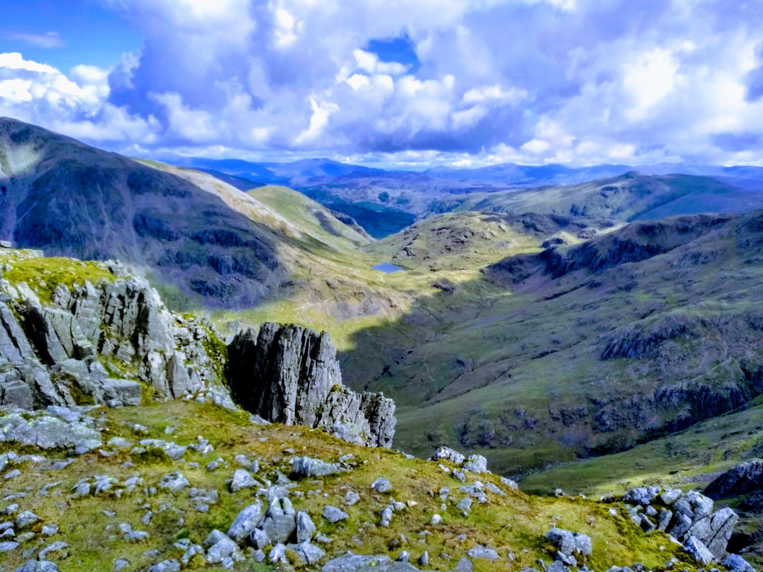 The interesting rocky outcrops in front of Great Gable’s shoulder, looking towards Styhead Tarn in the distance and across the central fells