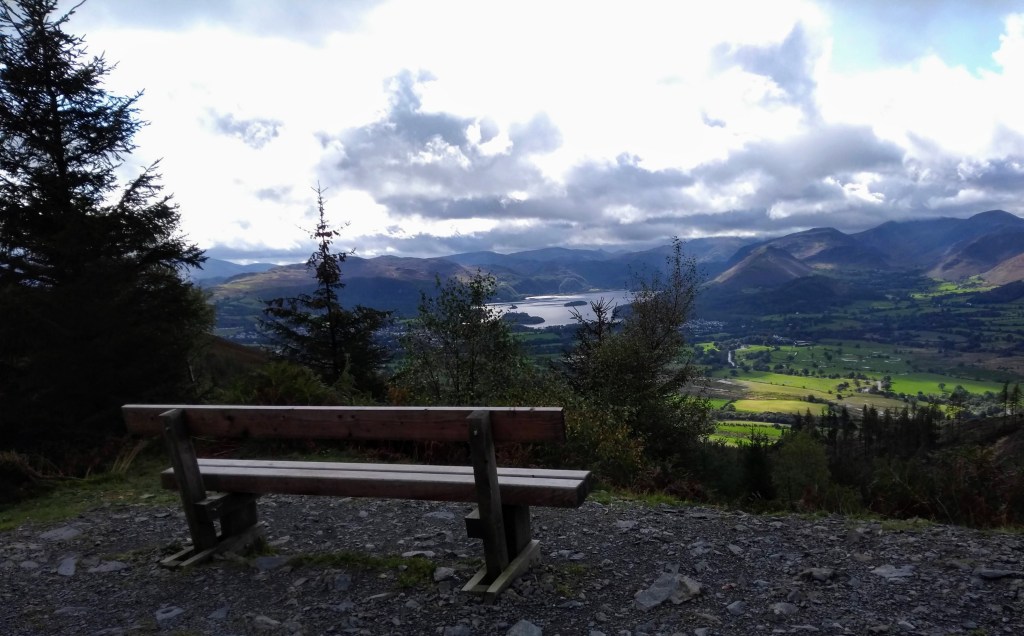 The lovely bench facing over Derwentwater and the pasture land between the Skiddaw range and those beyond